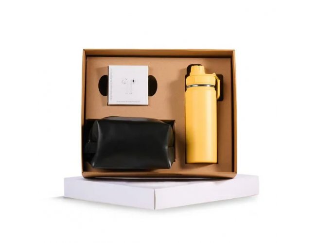 Sugestão de Personalização: Uma gravação a Laser na garrafa; uma gravação em Silk/Digital no fone, necessaire e tampa da caixa.