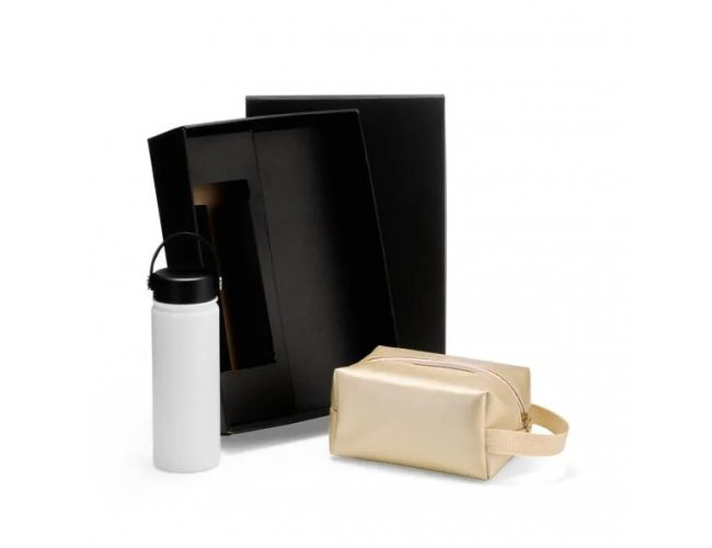 Sugestão de Personalização: Uma gravação a Laser na garrafa; uma gravação em Silk/Digital na necessaire e tampa da caixa.