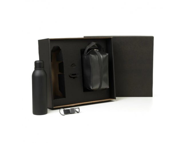 Sugestão de Personalização: Uma gravação a Laser na garrafa e chaveiro; uma gravação em Silk/Digital na necessaire e tampa da caixa.