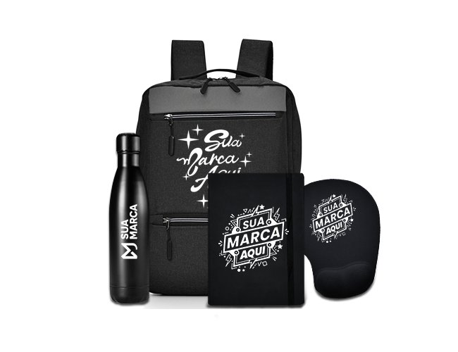 Sugestão de Personalização: Uma gravação a Laser na garrafa; uma gravação em Silk na mochila; uma gravação em Silk na caderneta; uma gravação em Silk no Mouse Pad Ergonômico.
