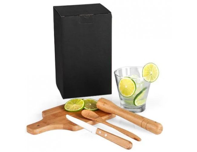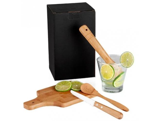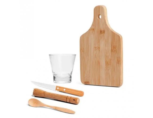 Conjunto composto por quatro acessórios para Caipirinha, sendo um copo em vidro de 350ml; socador/pilão e tábua pequena em bambu com cabo e orifício para pendurá-lo em ganchos e facilitar seu uso. Acompanha também uma faca para frutas de 4” em Madeira/Inox.
