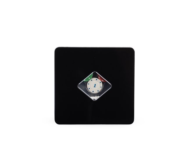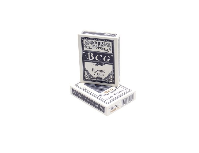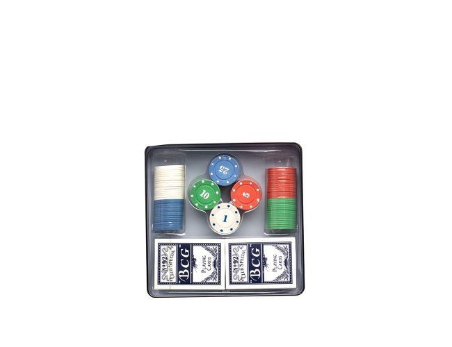 Kit poker formado por dois baralhos completos, com 54 cartas cada, além de uma ficha de dealer e cerca de 100 fichas coloridas, distribuídas em quatro cores com 25 unidades cada. Acompanha um estojo metálico para guardar os itens do conjunto.