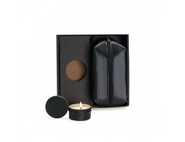 Sugestão de Personalização: Uma gravação a Laser na tampa da vela; gravação em Silk Digital na necessaire e na tampa da caixa.