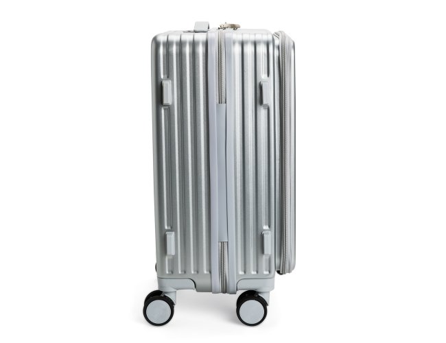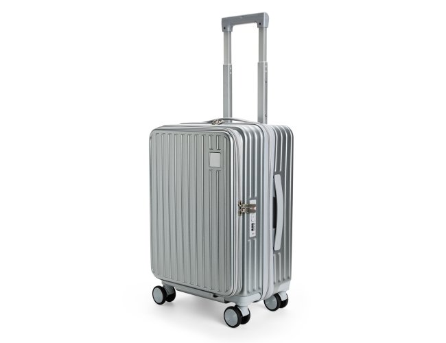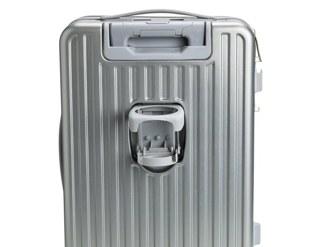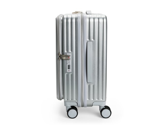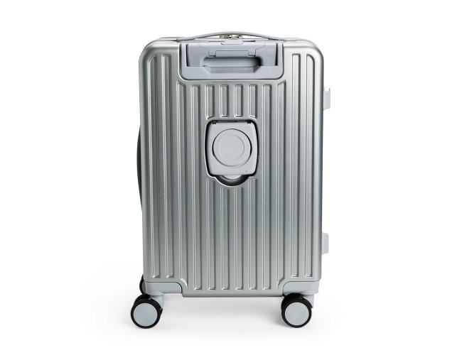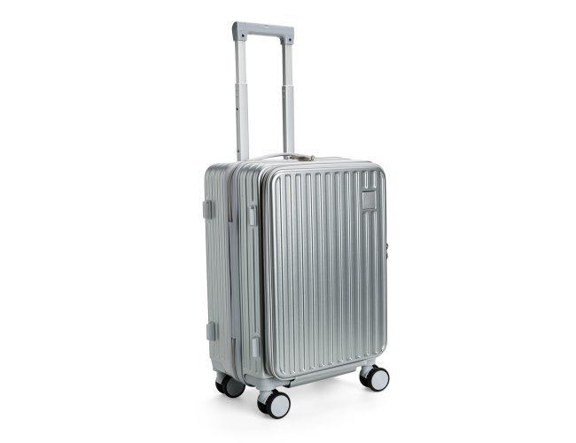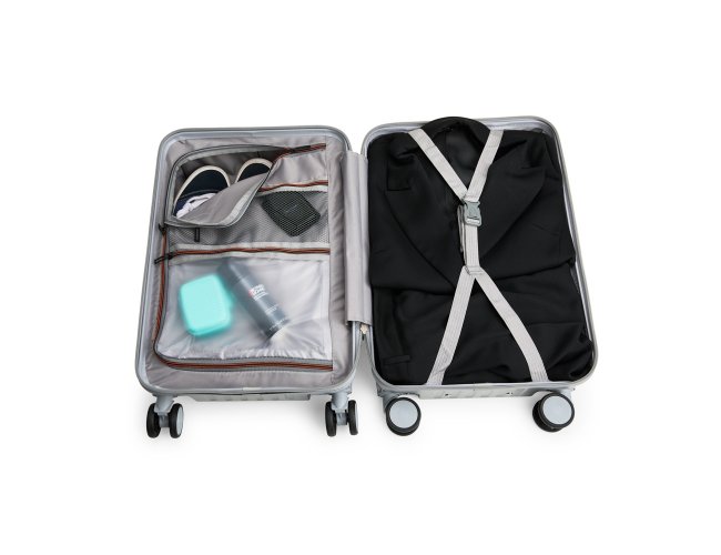 Mala de viagem feita em policarbonato (PC) com capacidade de até 32 litros. Apresenta compartimentos internos de difernetes tamanhos, incluindo um bolso telado e outro em plástico para itens molhados, além de cinta compressora no lado oposto. Possui alça superior, alça lateral, puxador retrátil ajustável, quatro rodinhas com rotação de 360 graus, adaptador para cabo USB, suporte para copo ou garrafa, quatro apoios laterais e cadeado numérico TSA. Dispõe ainda de compartimento frontal com três bolsos em tamanhos variados.
