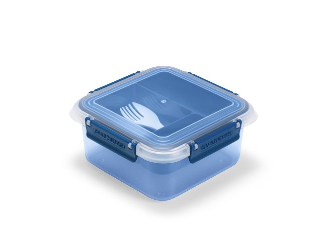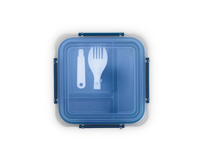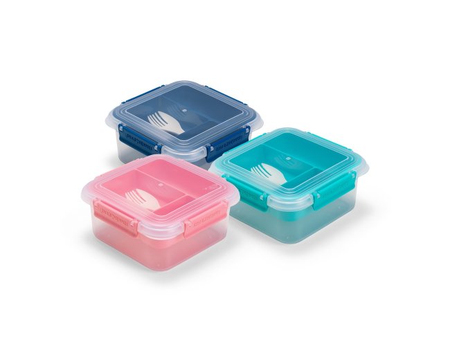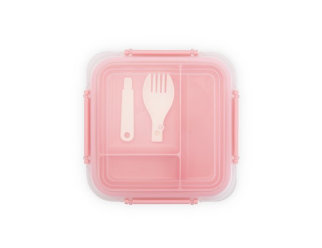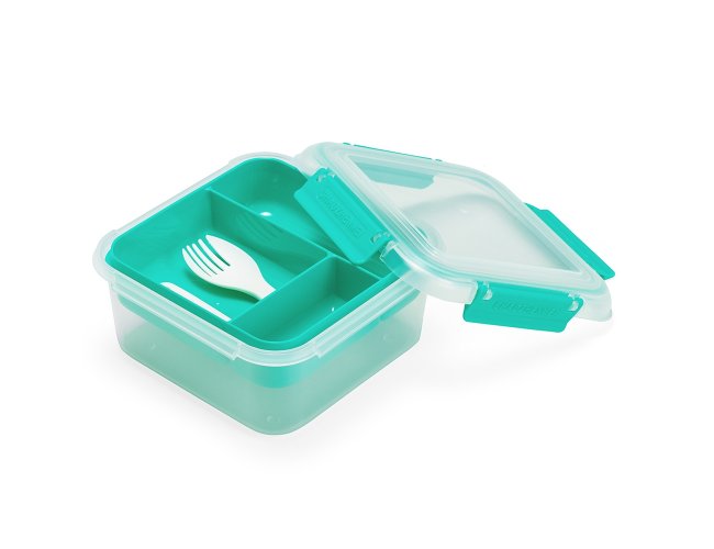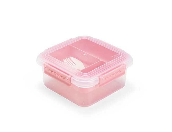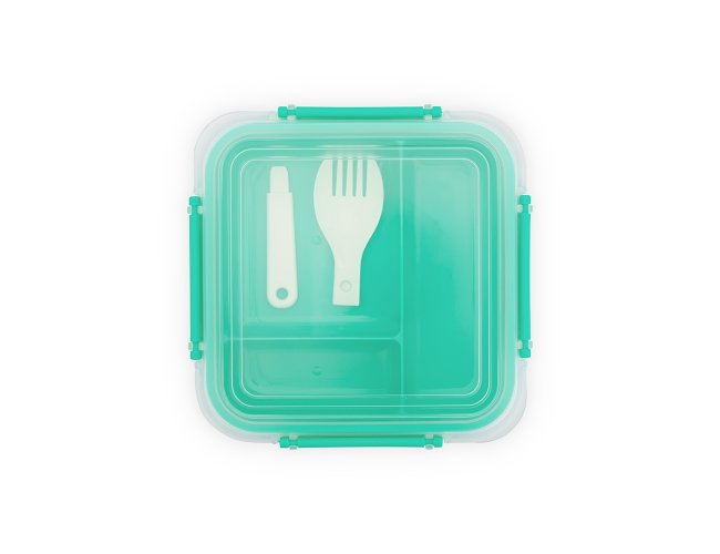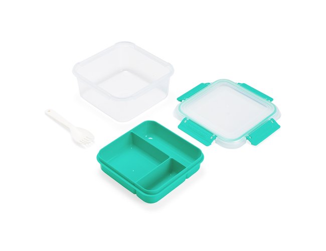 Marmita em plástico polipropileno (PP) livre de BPA com capacidade máxima de 1 litro combinada com a divisória removível. Possui tampa hermética com anel de vedação em silicone e quatro travas laterais. Acompanha colher tipo spork em PP.
