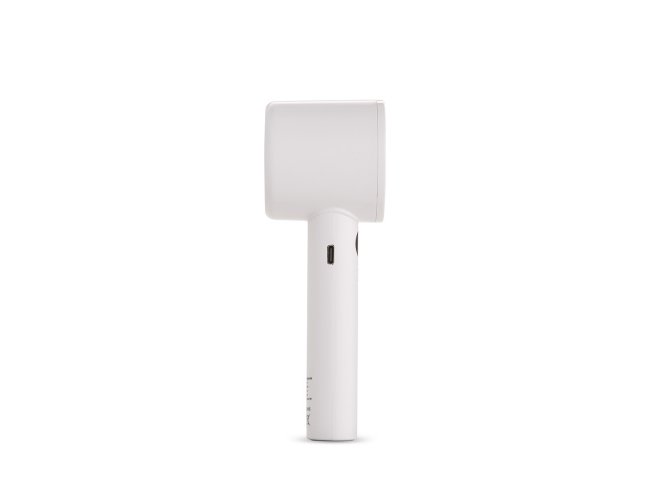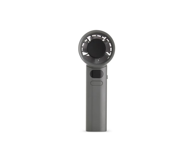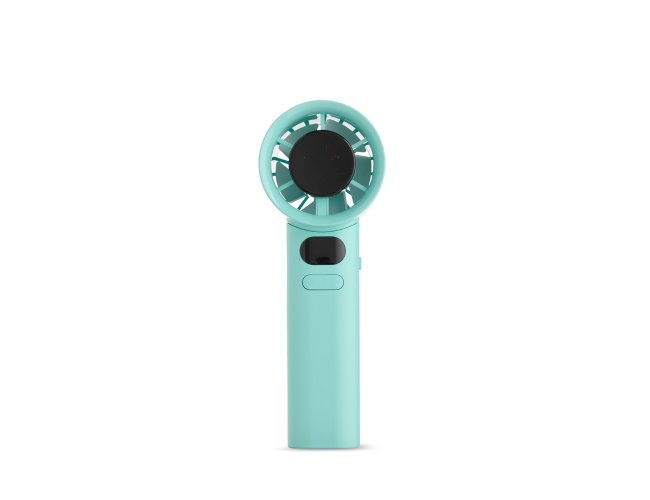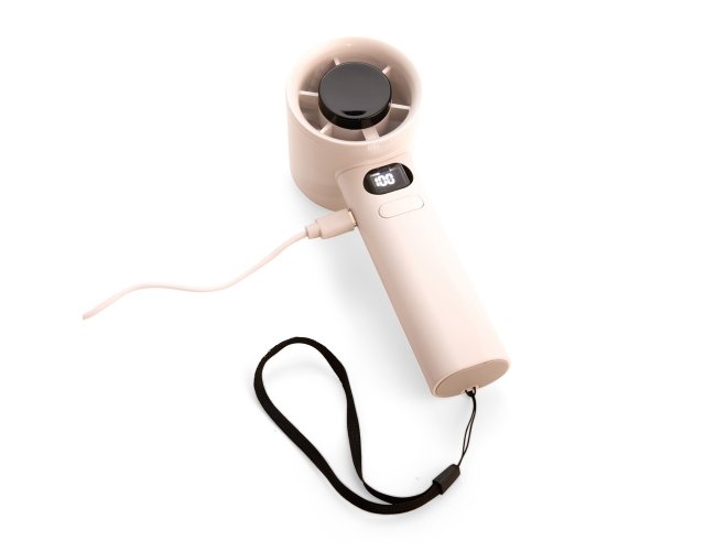 Mini ventilador recarregável em plástico e metal. Possui controle de velocidade ajustado por botões frontais, acionamento por chave seletora e painel de LED que exibe níveis de velocidade e carga da bateria. Acompanha cabo USB-C e cordão em nylon.