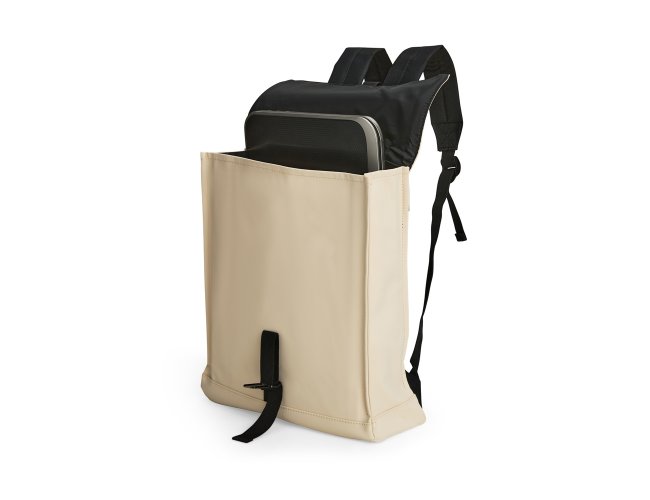 Mochila em couro sintético impermeável com capacidade de até 16 litros. Apresenta compartimento interno com bolso para notebooks de até 13 polegadas. Possui duas alças para as costas, alça de mão e engate posterior para mala de viagem.
