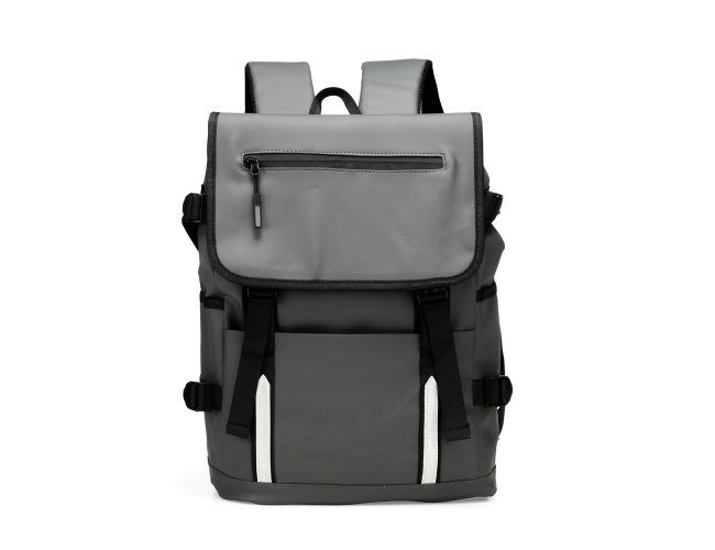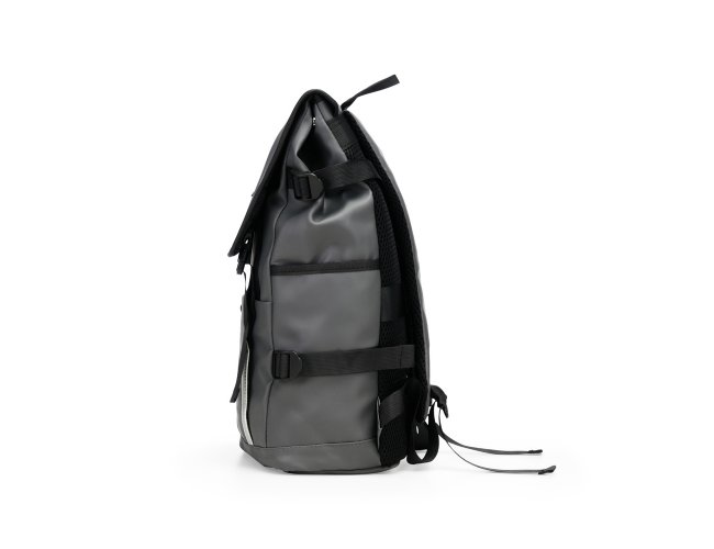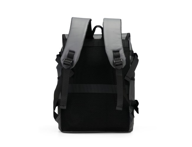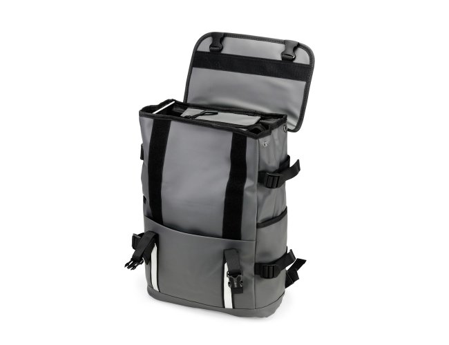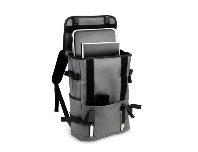 Mochila confeccionada em couro sintético com capacidade máxima de 18 litros. Possui abertura com zíper, tiras frontais em velcro e engate rápido. Apresenta divisória interna para notebook de até 15,6 polegadas, além de dois bolsos laterais e dois frontais, sendo um com fechamento em zíper próximo à abertura. Conta ainda com alças ajustáveis, costas acolchoadas em espuma respirável e engate traseiro para malas.