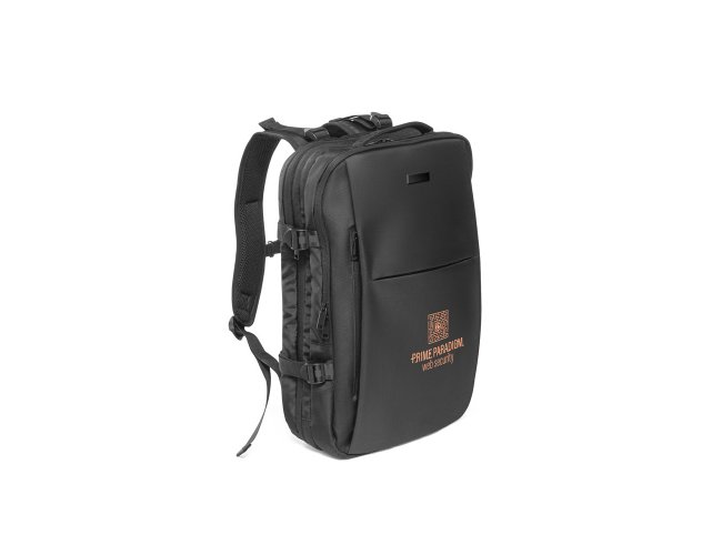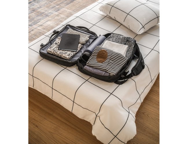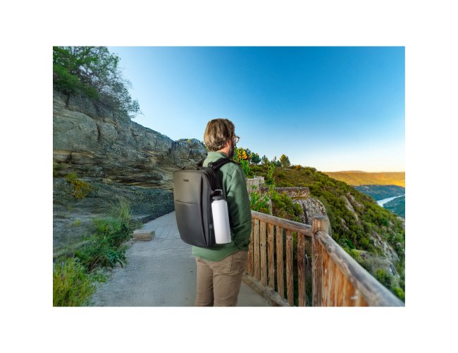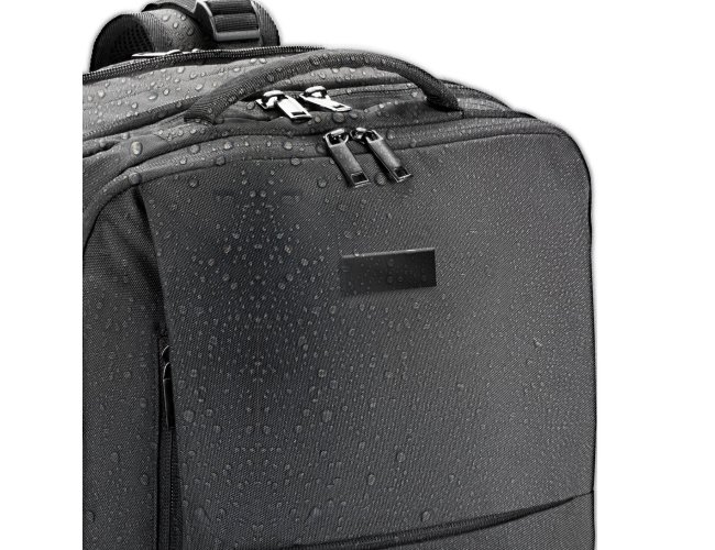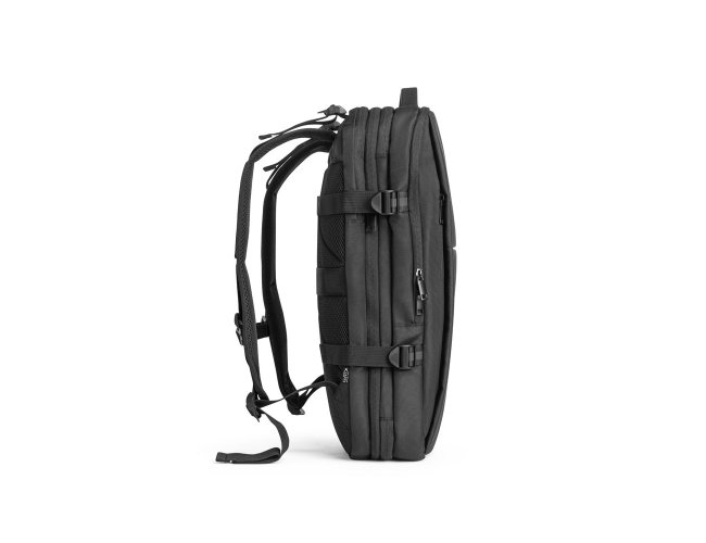 Mochila de viagem em poliéster reciclado (rPET) 600D de alta densidade, com acabamento repelente à água. Composta por 3 compartimentos principais com forro em poliéster reciclado (rPET) 210D: compartimento traseiro com bolso para notebook até 17.3" e bolso para tablet até 10.1", compartimento central expansível com zíper destinado à arrumação de roupa e um compartimento frontal com vários bolsos interiores. Possui ainda três bolsos frontais, dois deles com forro em PEVA com dimensões distintas, ideais para colocar o seu squeeze, roupa molhada ou cosméticos. Além destas características, reúne ainda outros diferenciais como: placa metálica removível com ímã para fácil gravação, alças de ajuste que tornam esta mochila mais confortável, cintas de compressão nas laterais, pegas superiores e laterais almofadadas. A parte posterior incorpora uma alça para trolley em caso de necessidade. Capacidade até 29 L. Expandida: 320 x 460 x 200 mm | Compacta: 320 x 460 x 110 mm