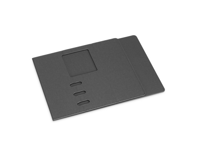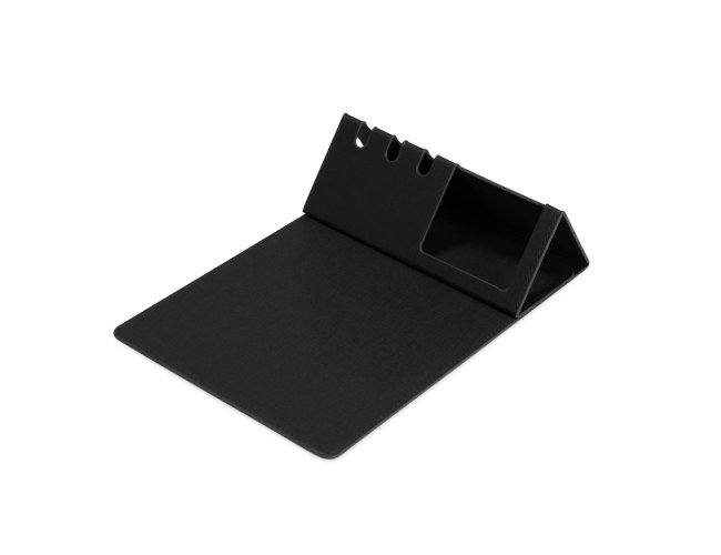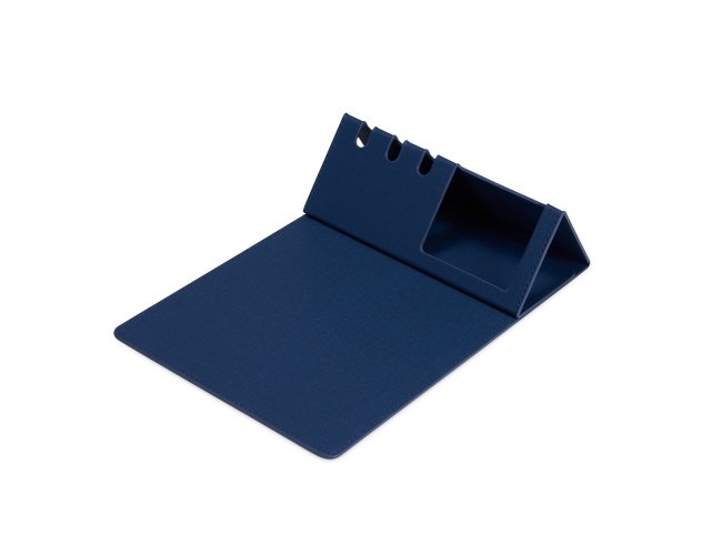 Mouse pad com estrutura em papelão resistente e revestimento em poliuretano (PU). Possui design dobrável com espaço para suporte de celular e porta-canetas.