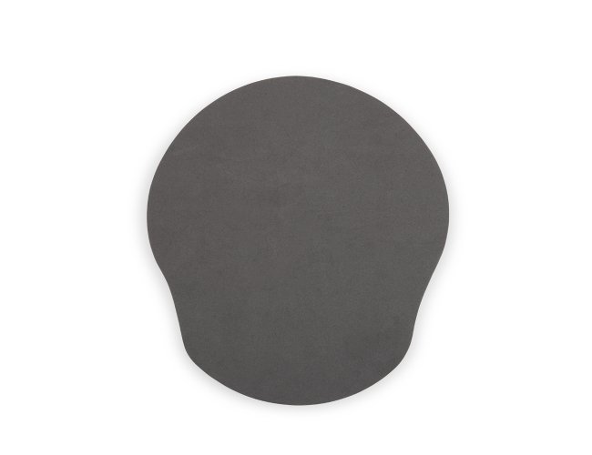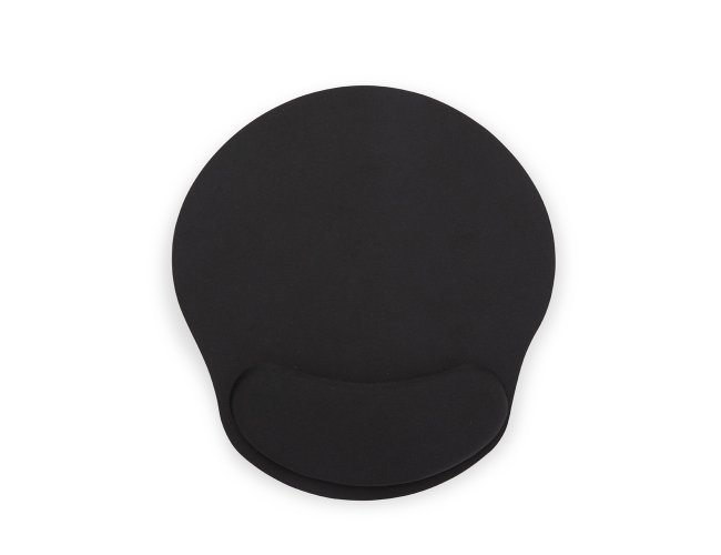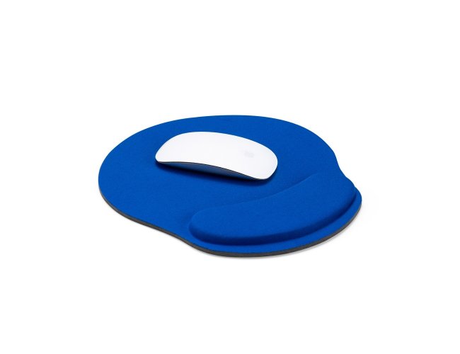 Mouse pad ergonômico com apoio em espuma para o punho, superfície em tecido sintético e base em EVA.