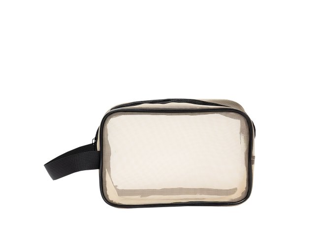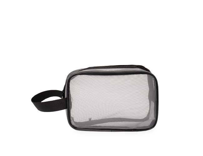 Nécessaire confeccionada em tela de nylon com fechamento em zíper e alça lateral para transporte.