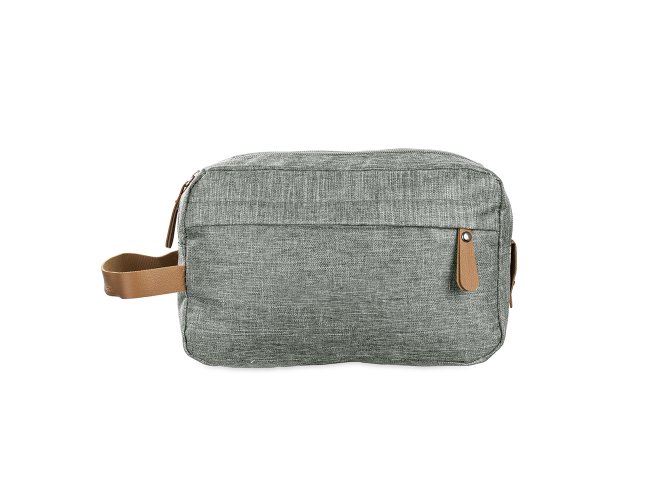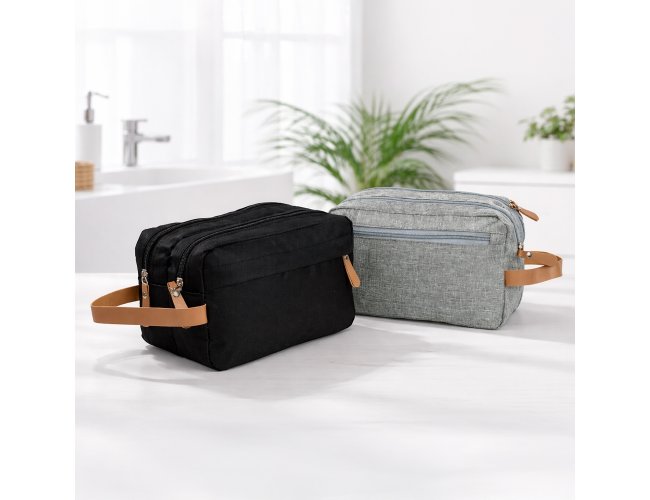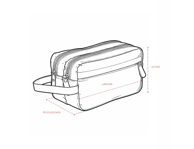 Nécessaire em poliéster 300D catiônico resistente à água com alça de mão lateral e puxadores de zíper em couro sintético. Possui dois compartimentos com revestimento em poliéster 210D, sendo um deles com cinco bolsos de diferentes tamanhos, incluindo dois em tela. Conta também com dois bolsos externos de tamanhos variados e fechamento em zíper.