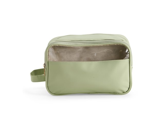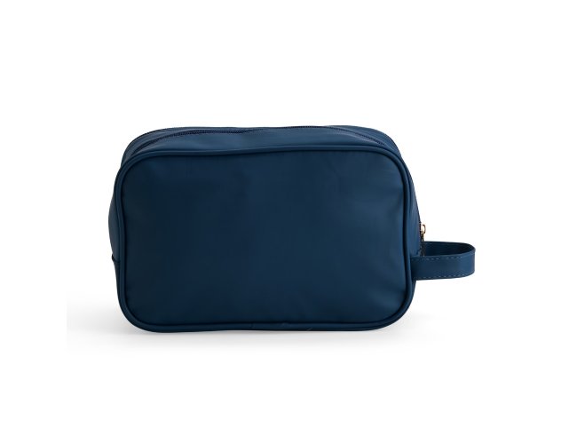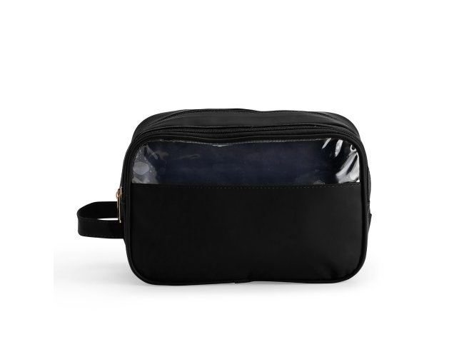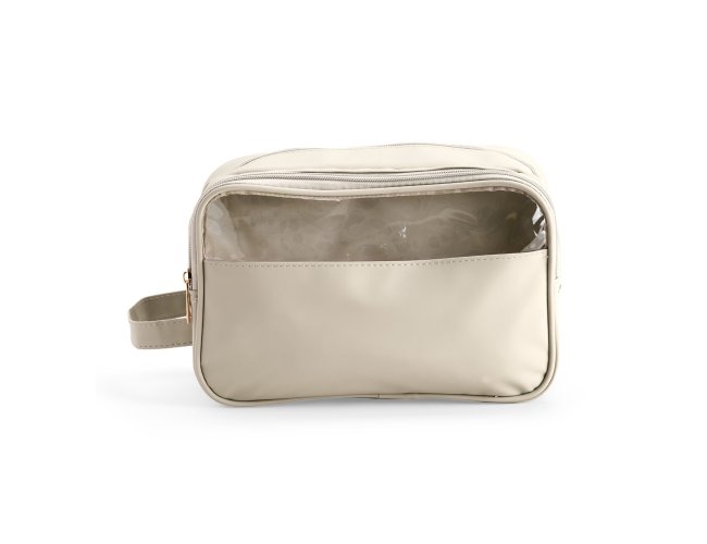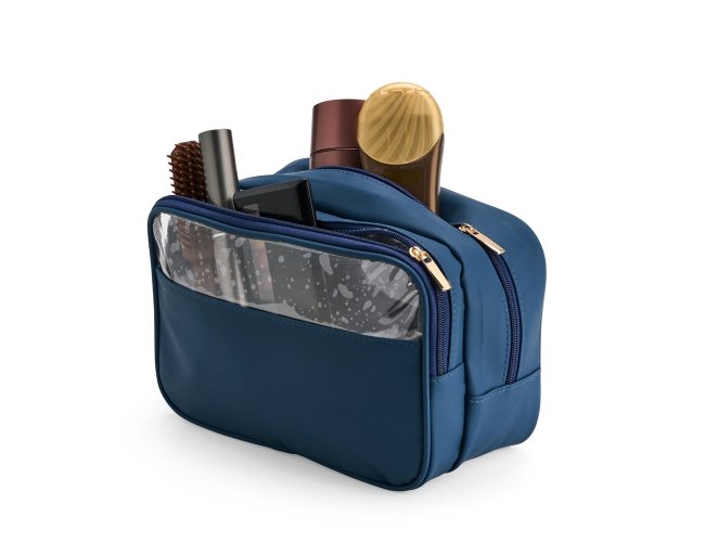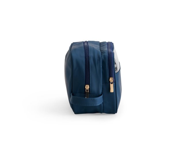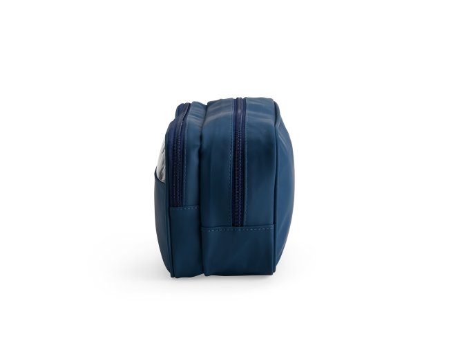 Nécessaire confeccionada em filme sintético de poliuretano impermeável. Possui dois bolsos no compartimento interno principal, sendo um com fechamento em zíper e outro em tela de nylon. Dispõe ainda de compartimento frontal com viseira e revestimento interno em PVC, ideal para guardar itens molhados.