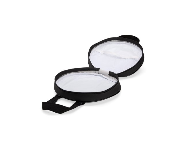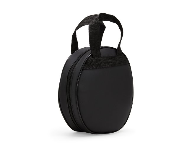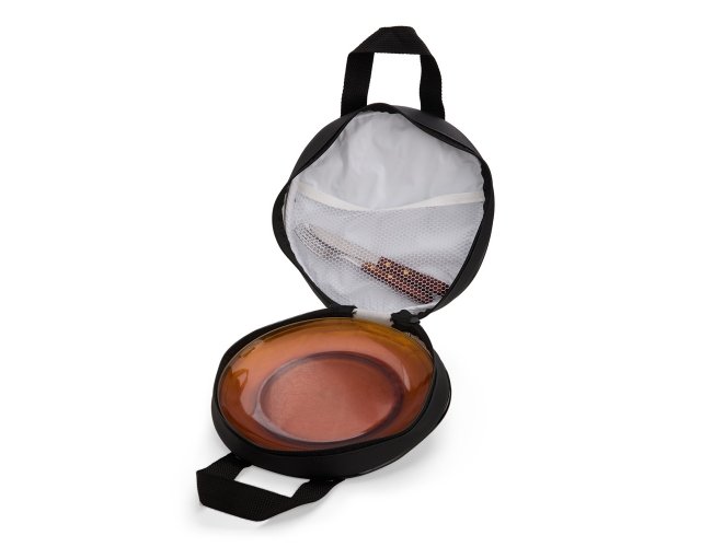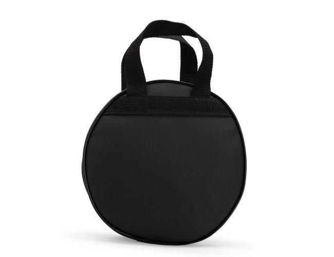 Bolsa porta-pratos em couro sintético e fechamento em zíper. Possui compartimento interno que inclui bolso em tela de nylon, além de duas alças para transporte.