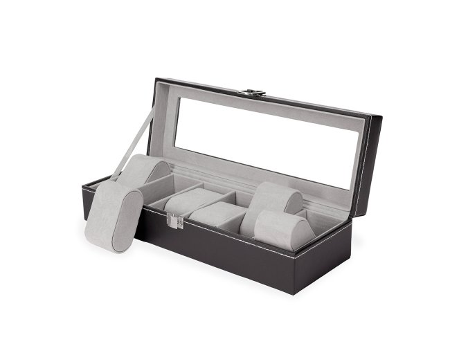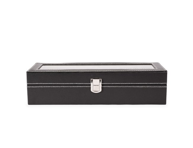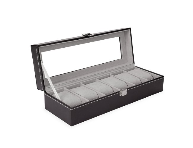 Porta-relógios com acabamento em couro sintético à base de PVC. Possui revestimento interno em veludo e seis divisórias com almofadas removíveis, além de visor de vidro na tampa e trava de segurança para o fechamento do estojo.
