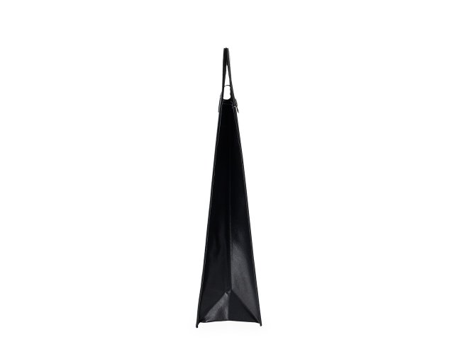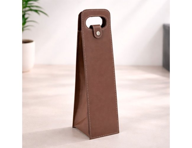 Porta-vinho confeccionado em couro sintético e estrutura interna em papelão. Possui alça de mão vazada e fechamento em botão metálico.