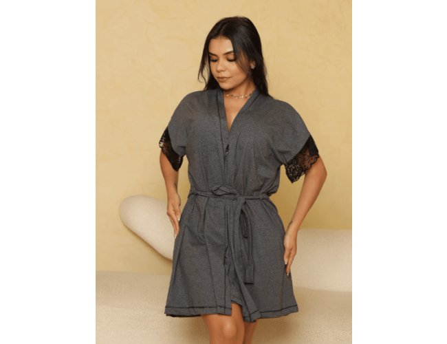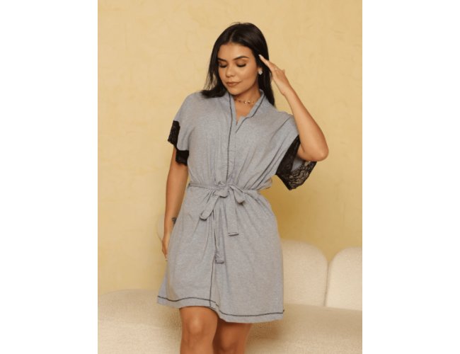 Com cinto, laço contraste, manga curta e comprimento longo.