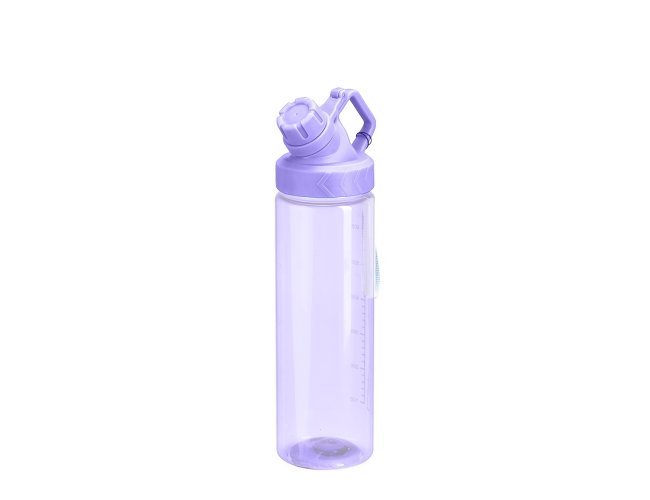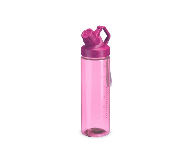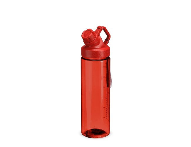 Squeeze plástico livre de BPA, com capacidade máxima de 750ml e marcação de volume de 700ml impressa no corpo. Dispõe de bocal plástico com protetor rosqueável para o bocal e alça fixa. Acompanha cordão de nylon para prender à alça da tampa.