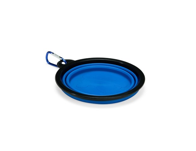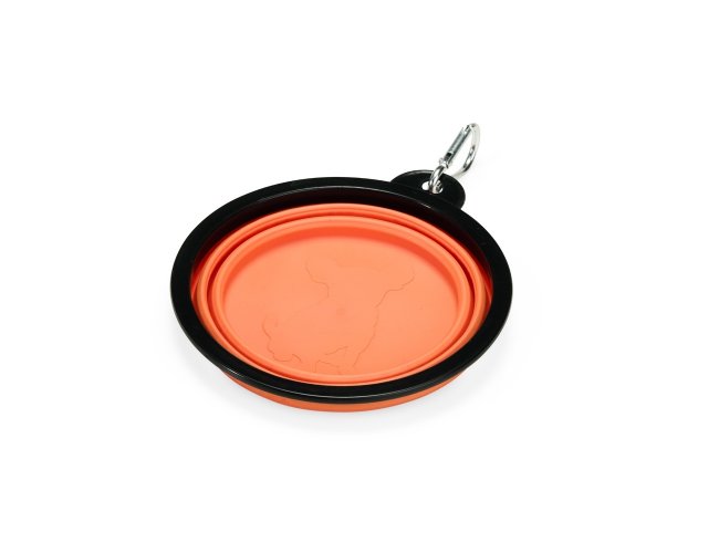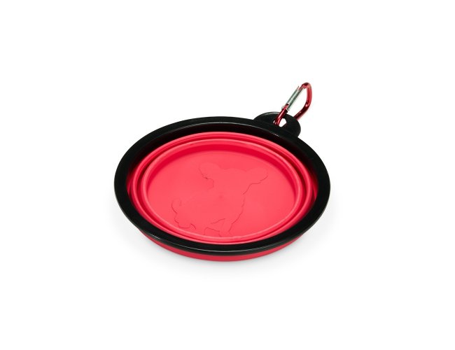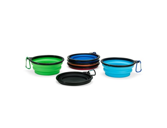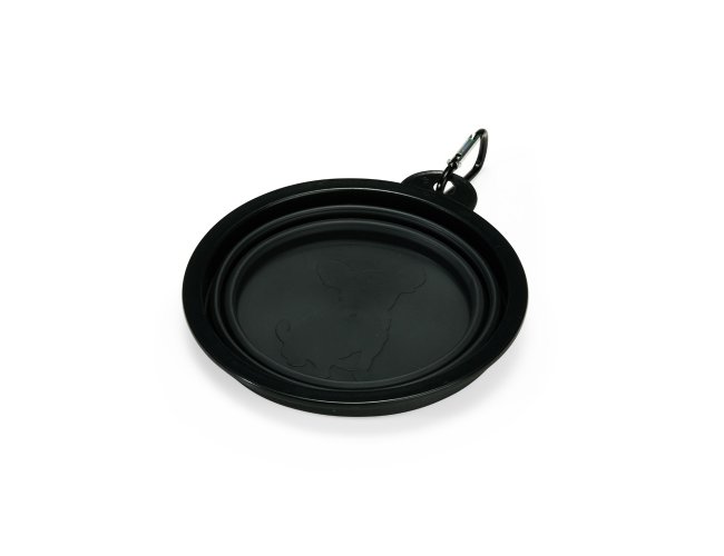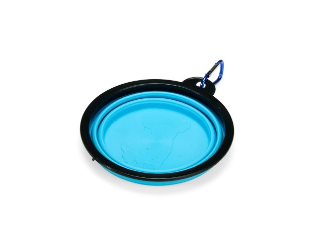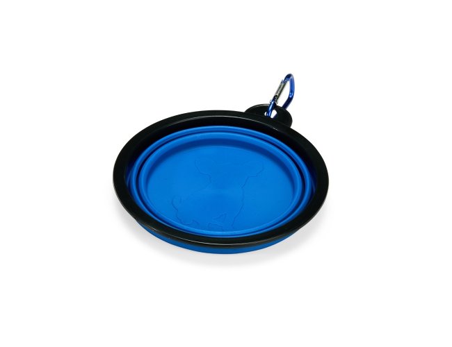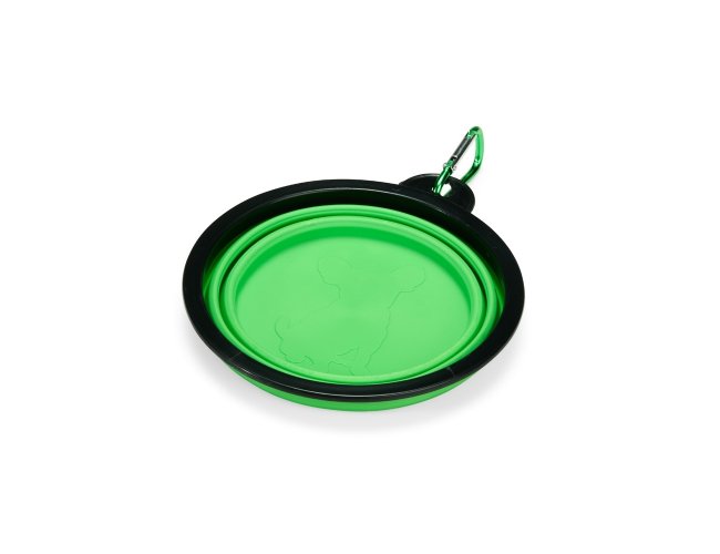 Tigela retrátil para pets feita em silicone com borda plástica equipada com encaixe para mosquetão e capacidade de até 350ml. Acompanha mosquetão metálico para facilitar o transporte.