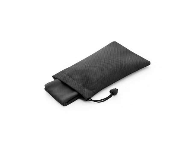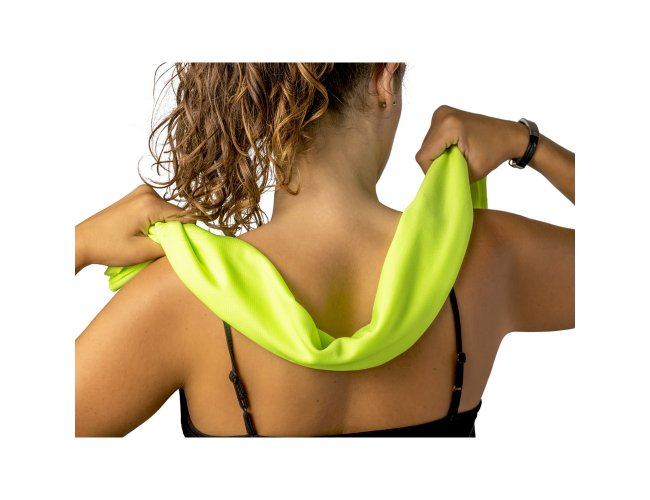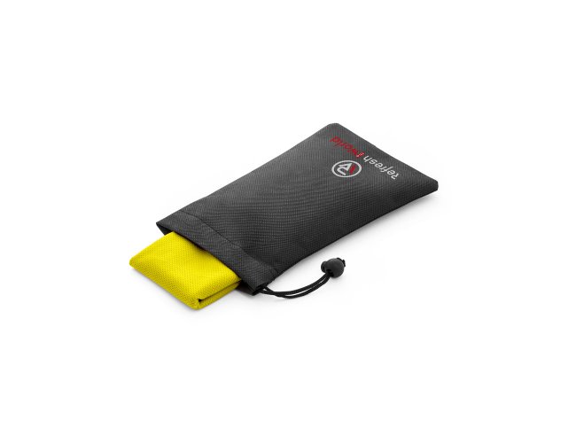 Toalha esportiva refrescante em poliéster 100% reciclado. Toalha reutilizável, lavável na máquina de lavar roupa. Fornecida numa bolsa preta em non-woven.